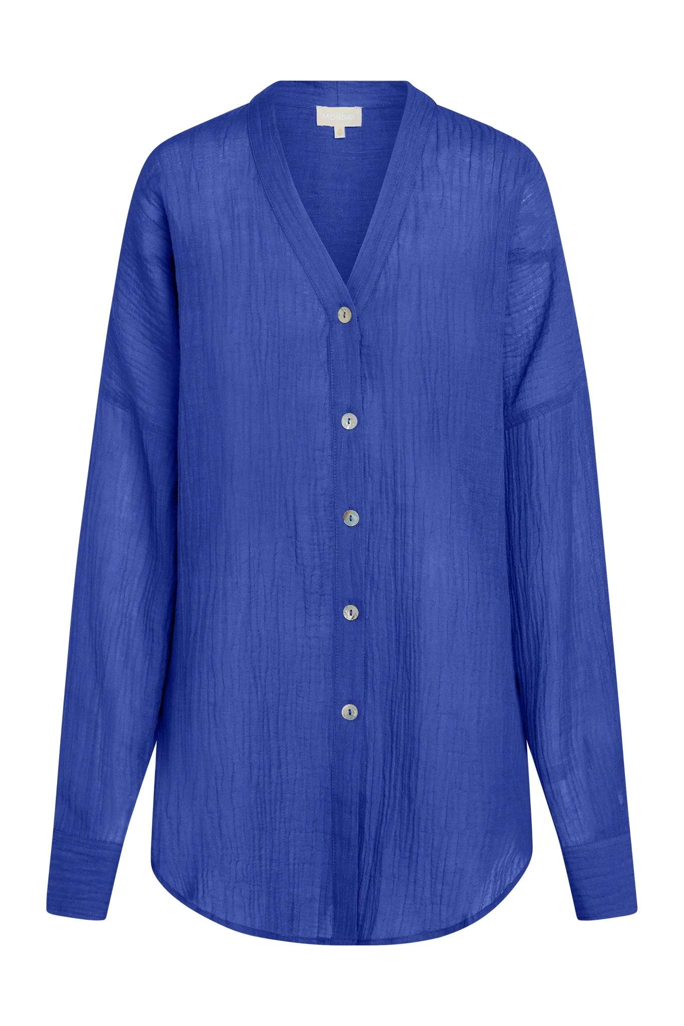 The ultimate beach to bar look can be achieved in the Barcelona Tunic. With an airy oversized fit, this transitional piece can be worn open, over your favorite swimwear or tied at the front with cute pants. Complete with side slits, flowy sleeves and center front seashell buttons.