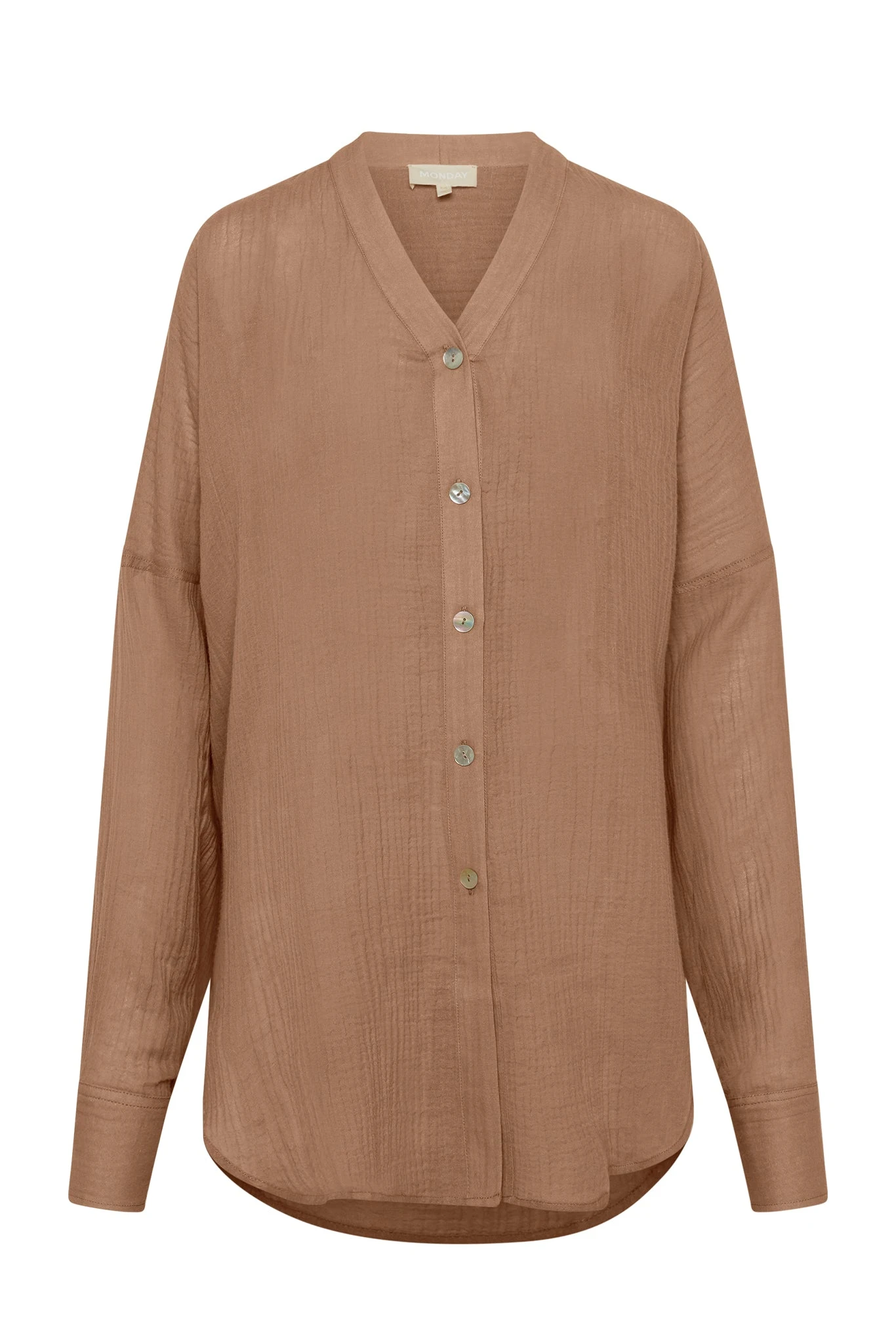 The ultimate beach to bar look can be achieved in the Barcelona Tunic. With an airy oversized fit, this transitional piece can be worn open, over your favorite swimwear or tied at the front with cute pants. Complete with side slits, flowy sleeves and center front seashell buttons.