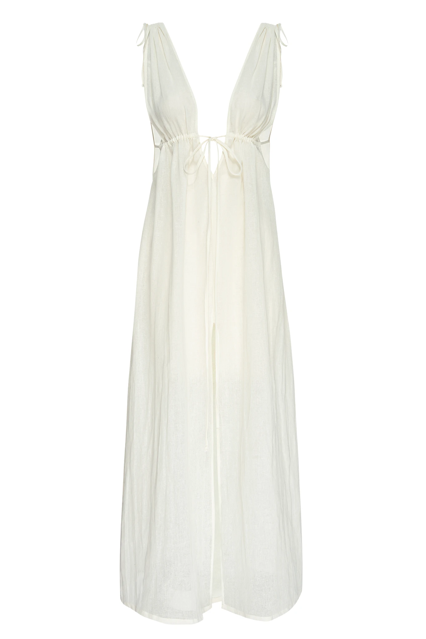Find your inner goddess in the Mallorca Dress. Offering a chic and elevated look, this maxi dress features cut out details, high slit details, a plunging neckline and wrap around tie detailing, perfect for a custom fit. Pair with any accessory for a beach-to-bar look.