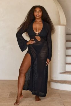 The Montego Dress will make you feel and look your best. Made in a luxe crochet knit, this elegant dress with a plunging neckline, gold ring detailing and high side seam slits will make you brighten up any room you walk in. Paired with any of our swim, this dress will elevate any beach look!