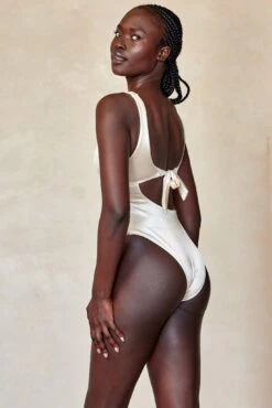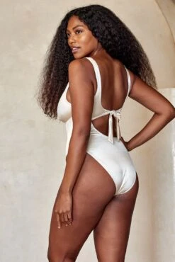 Our founders curated a special swim collection in celebration of our 10 year anniversary by hand-selecting a luxurious, satin shiny fabric that exudes confidence with every wear. This exclusive material offers a subtly distinct fit, setting it apart from our signature recycled jersey fabric that doesn’t stretch like our signature jersey, providing a more tailored and structured fit swimwear experience for you.